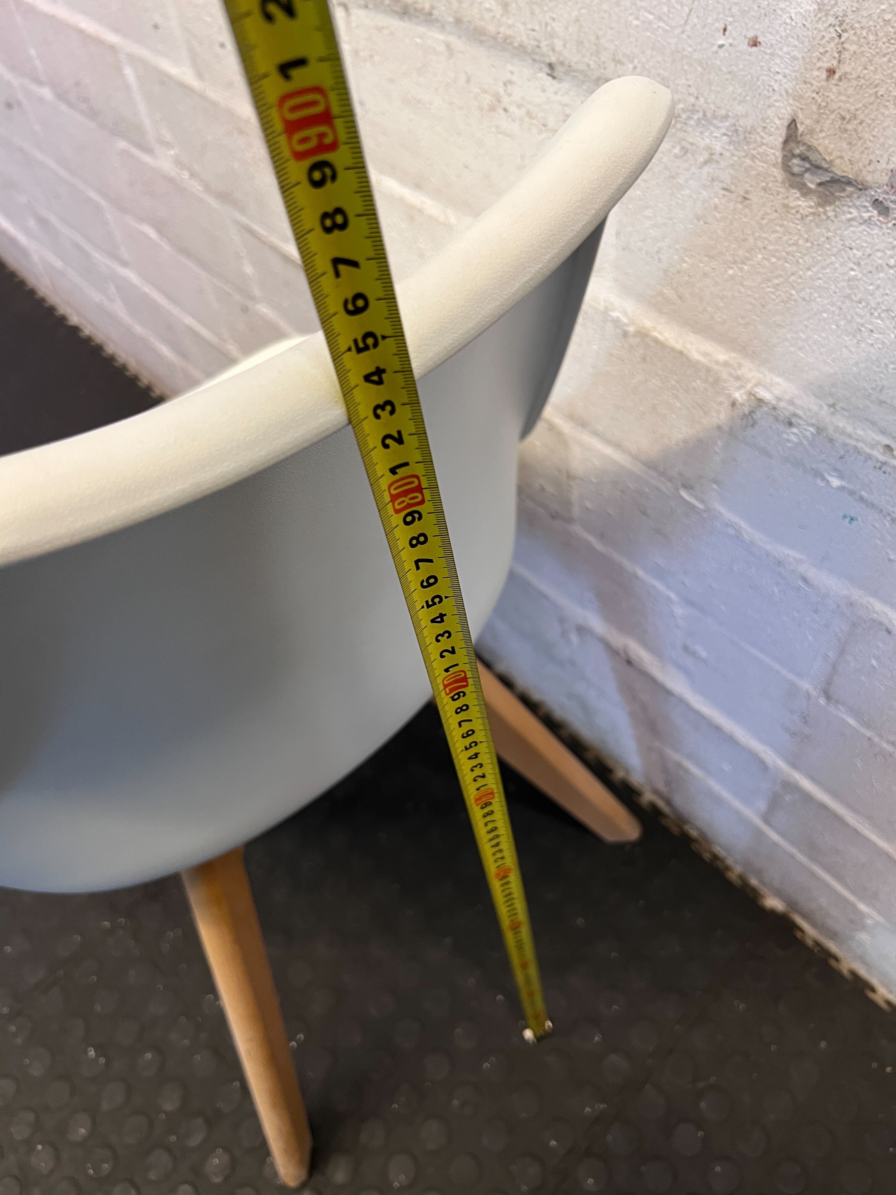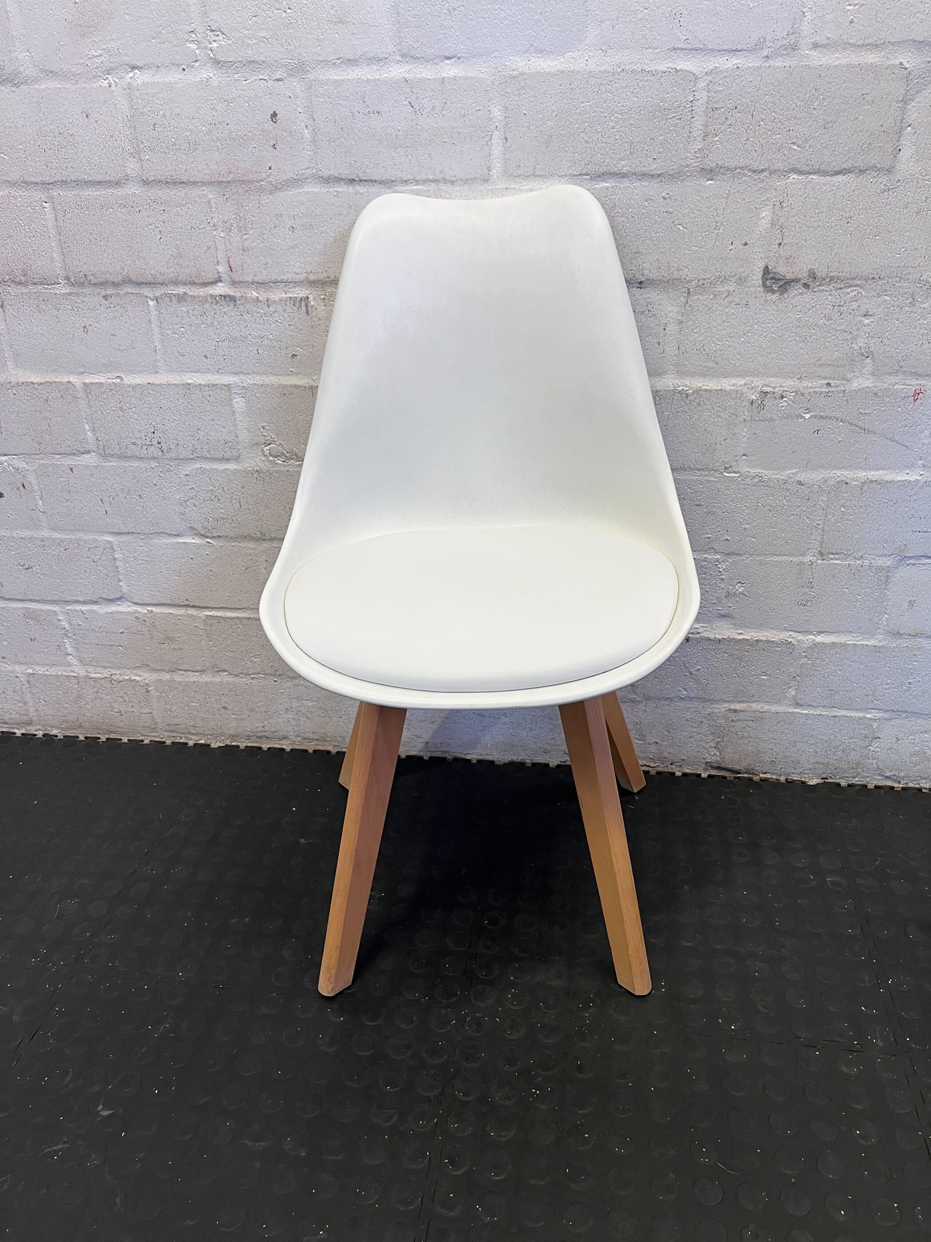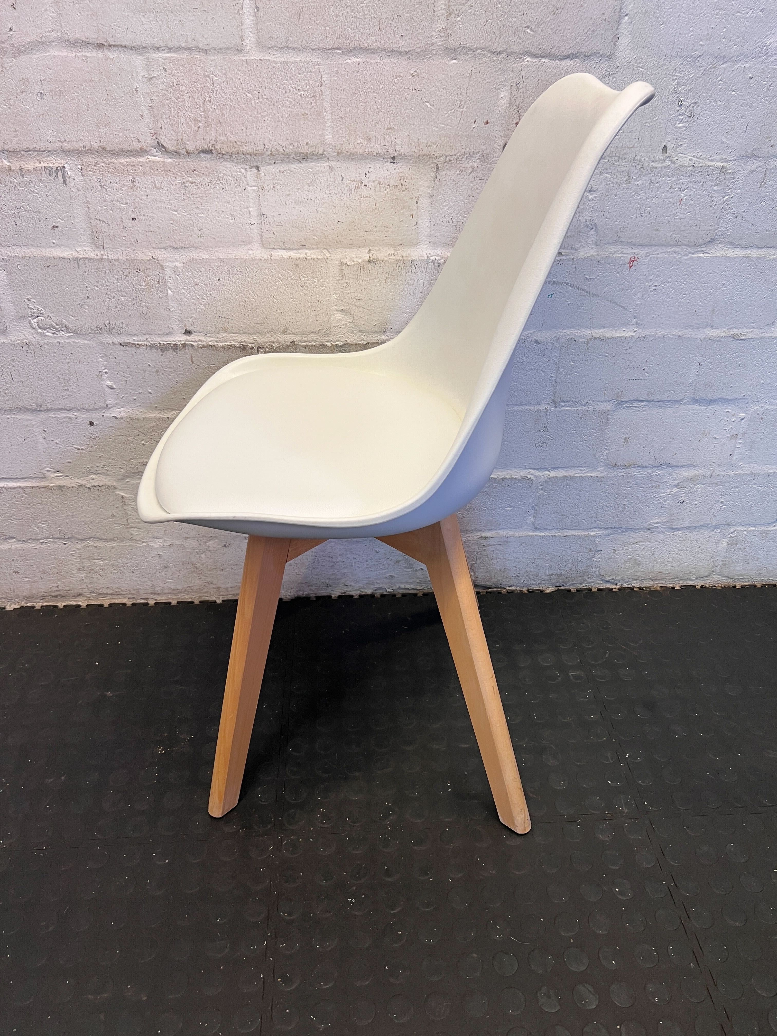 Elevate your dining space or add a touch of modern sophistication to any room with this stylish white and wood padded chair. Featuring a sleek, ergonomic white shell seat complemented by a comfortable, padded cushion, this chair offers both contemporary design and exceptional comfort. The sturdy, natural wooden legs provide a warm contrast and ensure stability, making it a versatile piece for your dining table, home office, or as an chic accent chair. Its clean lines and minimalist aesthetic will seamlessly blend with a variety of decor styles. 🛋️ Excellent pre-loved condition with minimal signs of use, consistent with a gently used item. The white shell and padded seat are clean, and the wooden legs are sturdy and free from major damage. This chair is ready to bring style and comfort to its new home. 💎