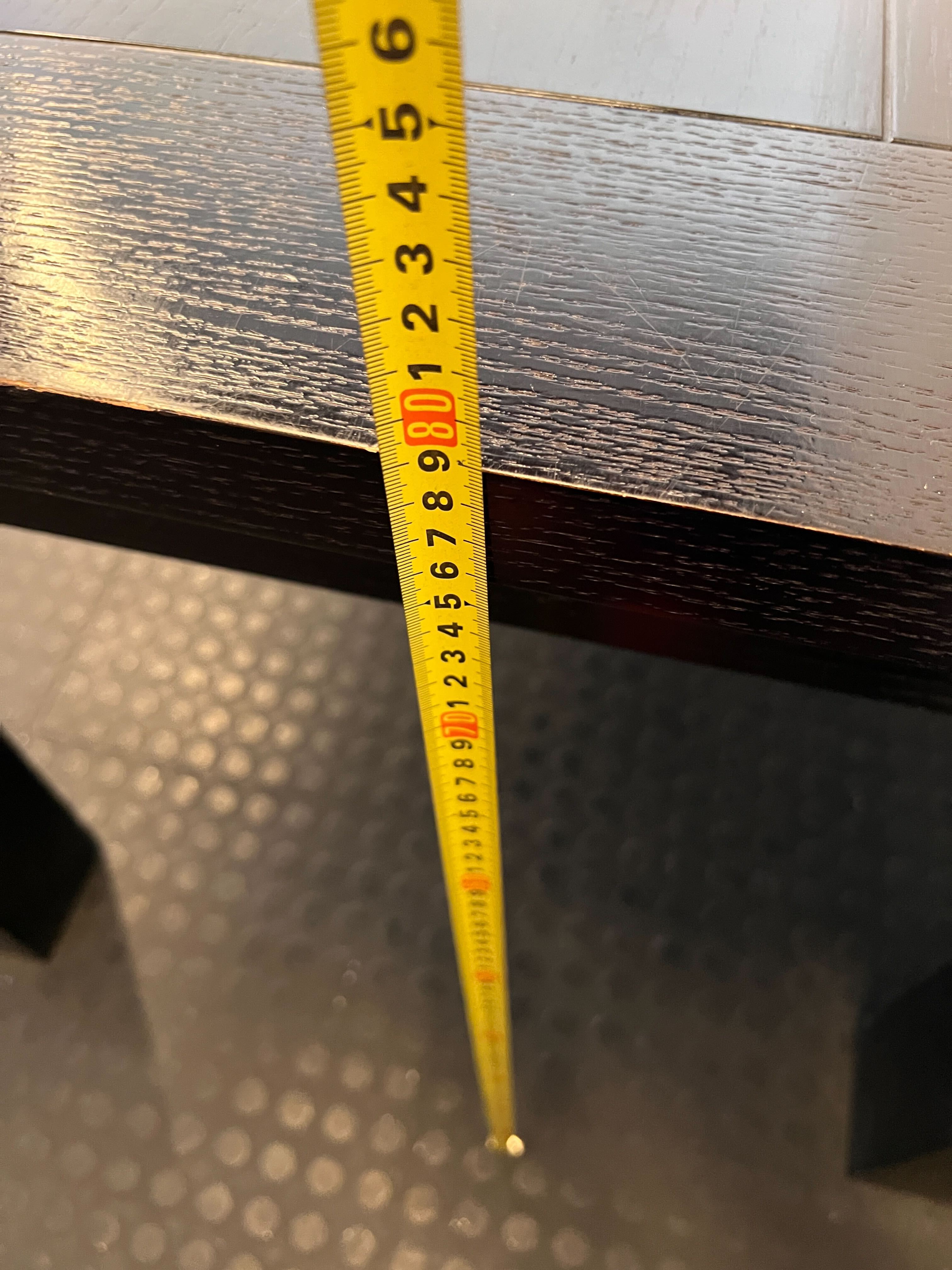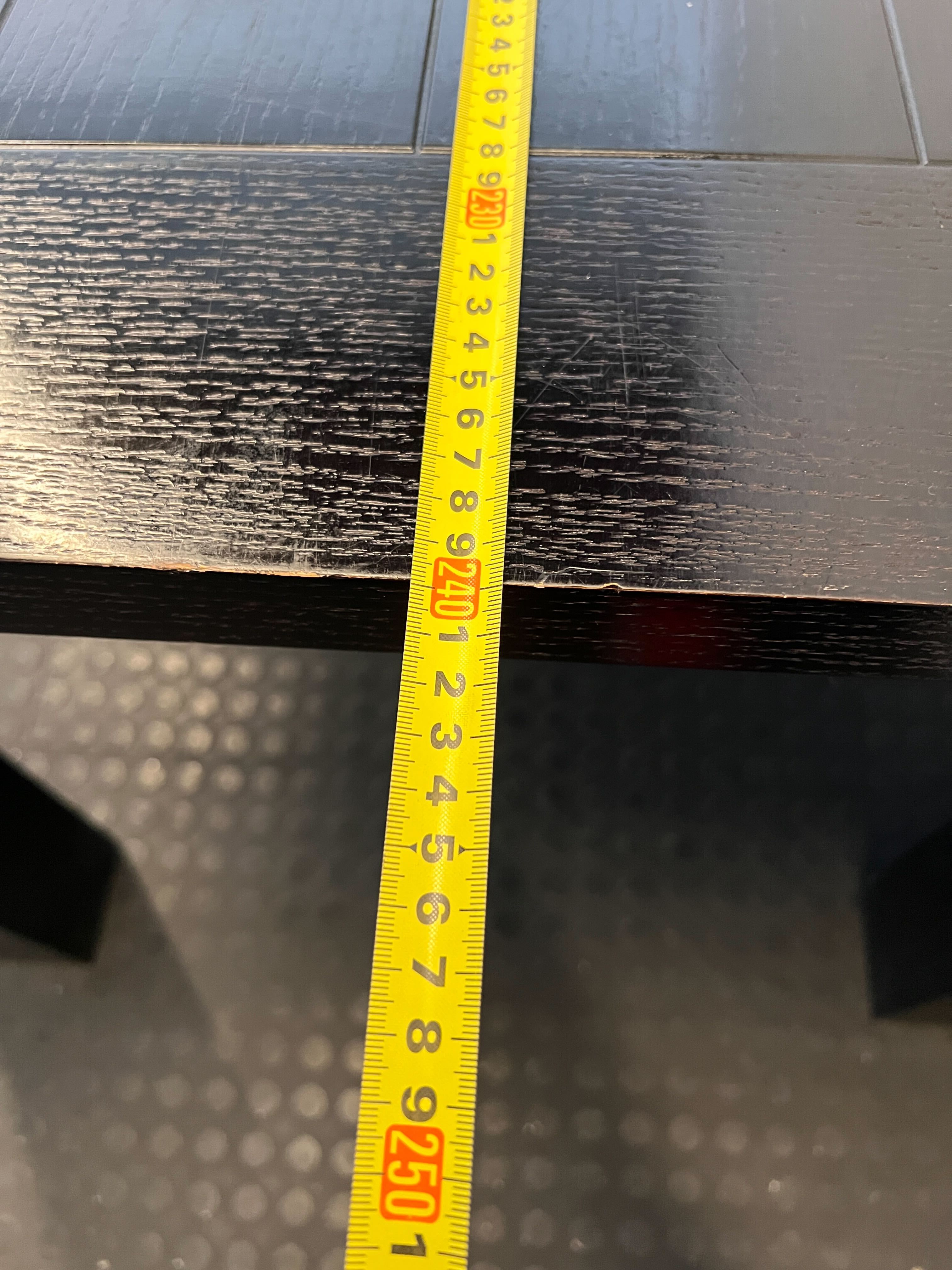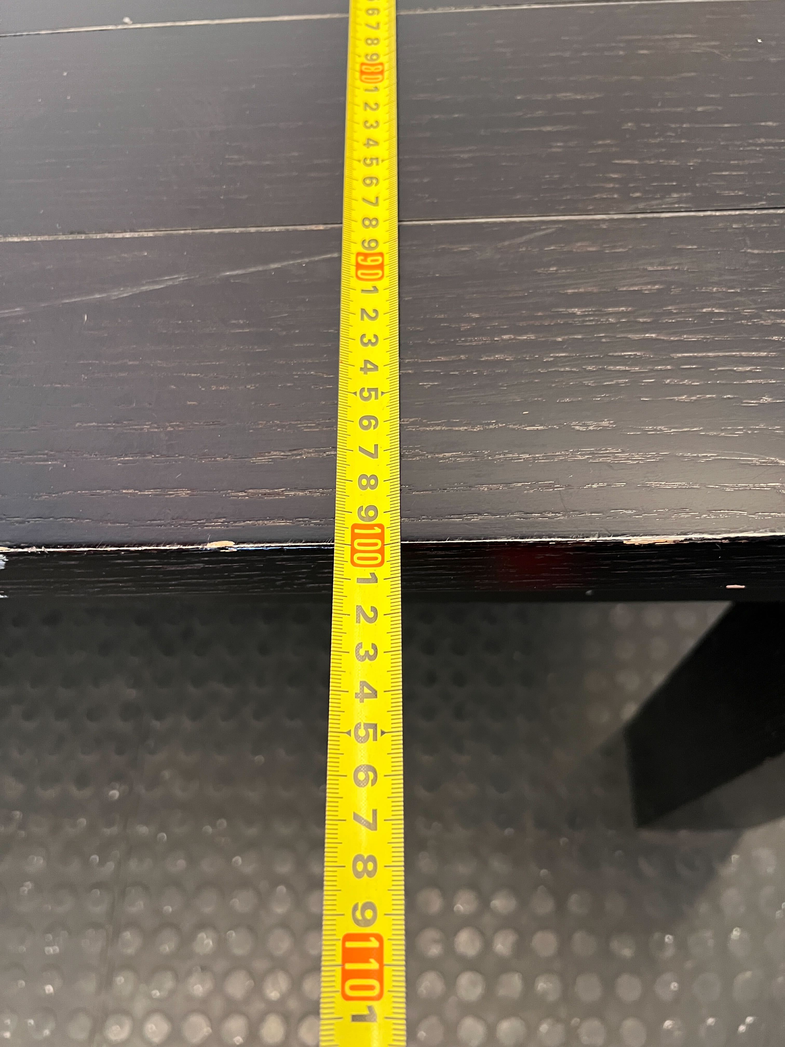 Discover this sturdy and versatile black slatted table, perfect for a variety of uses in your home or office! ✨ Its classic black finish and robust design make it an excellent choice for a dining table, a spacious desk for creative projects, or even a large console. This table offers ample surface area, combining practicality with a sleek, minimalist aesthetic that can complement many decor styles. Imagine it as the heart of your family meals or the expansive canvas for your next big project! 🍽️🛠️🏡 This pre-loved table shows signs of its journey, adding character and history. There are visible scratches and scuffs on the tabletop, consistent with regular use. The legs and edges also exhibit some chips and wear, as depicted in the images. Despite these imperfections, the table remains structurally sound and ready for its next chapter.