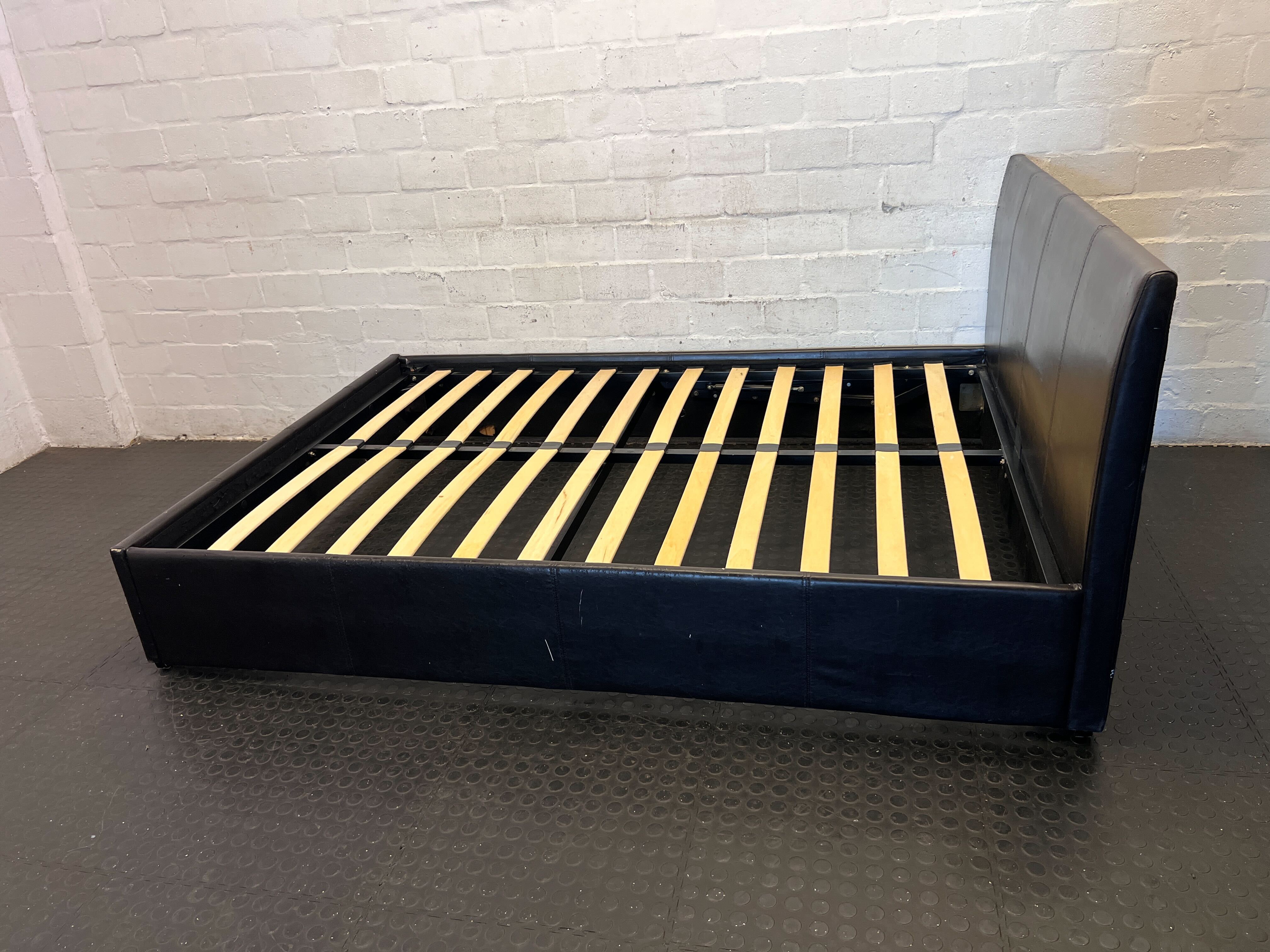 Transform your bedroom into a sleek and comfortable retreat with this stylish black upholstered bed frame! ✨ Featuring a contemporary design with a padded headboard and sturdy slatted base, it's perfect for creating a modern look in any room. This versatile bed frame provides excellent support for your mattress, ensuring a good night's sleep. Ideal for a master bedroom, guest room, or even a chic studio apartment. 🛋️ This bed frame is in good pre-loved condition. As visible in the images, there are some minor signs of wear consistent with normal use, such as light creasing on the faux leather upholstery, particularly on the headboard and side rails. The slatted base is fully intact and functional, ready for your mattress. Overall, a well-maintained piece ready for its new home.