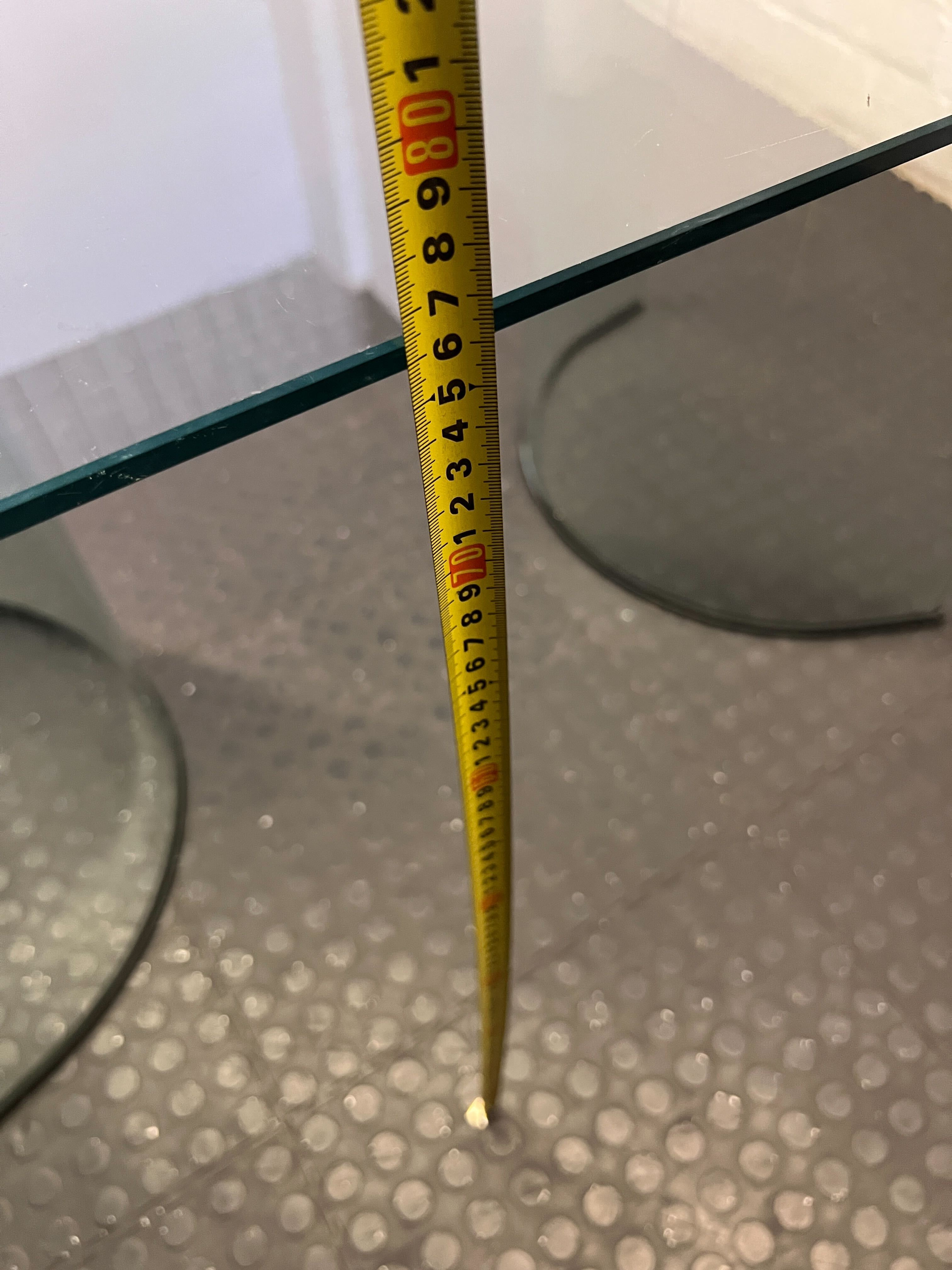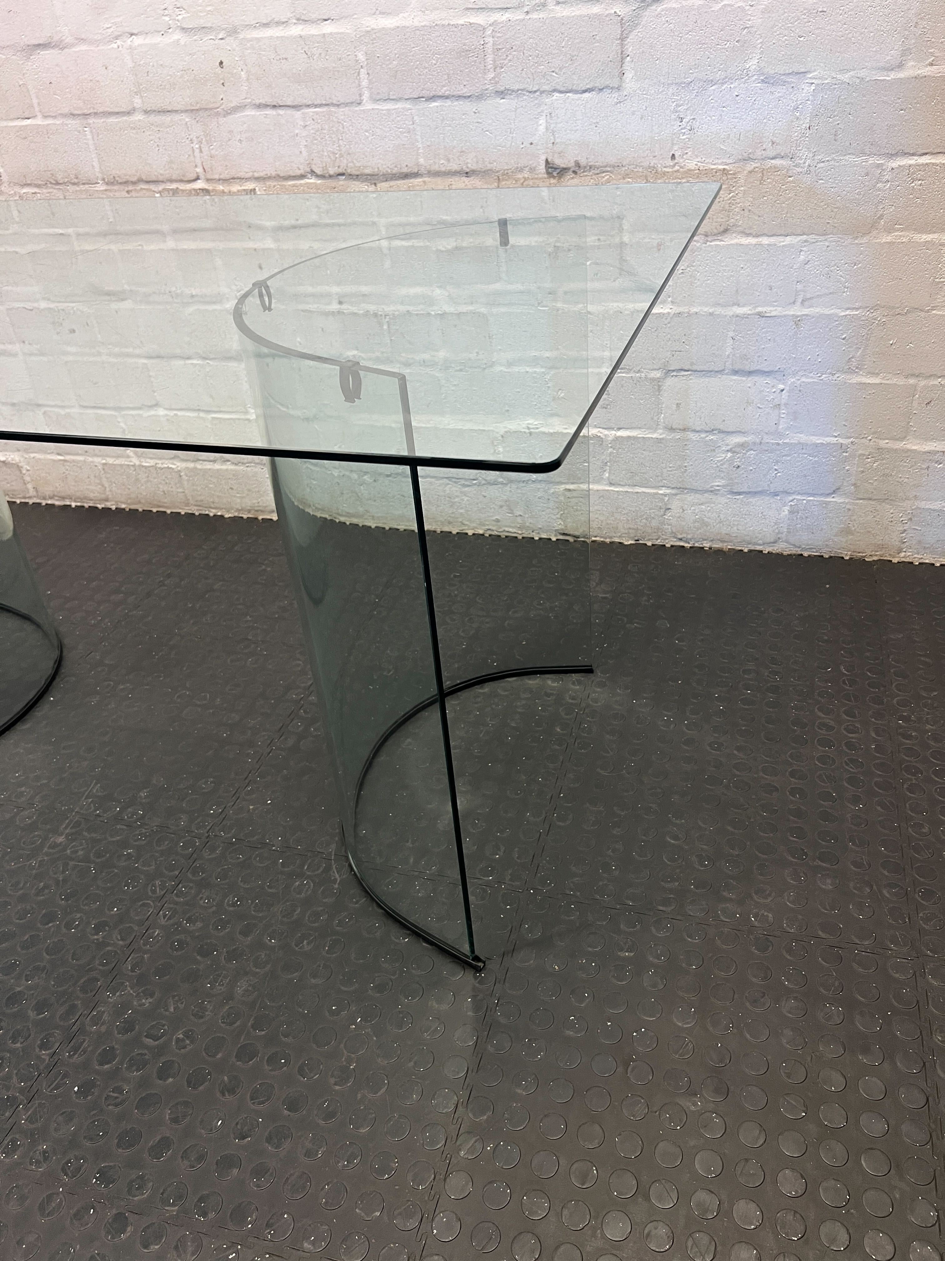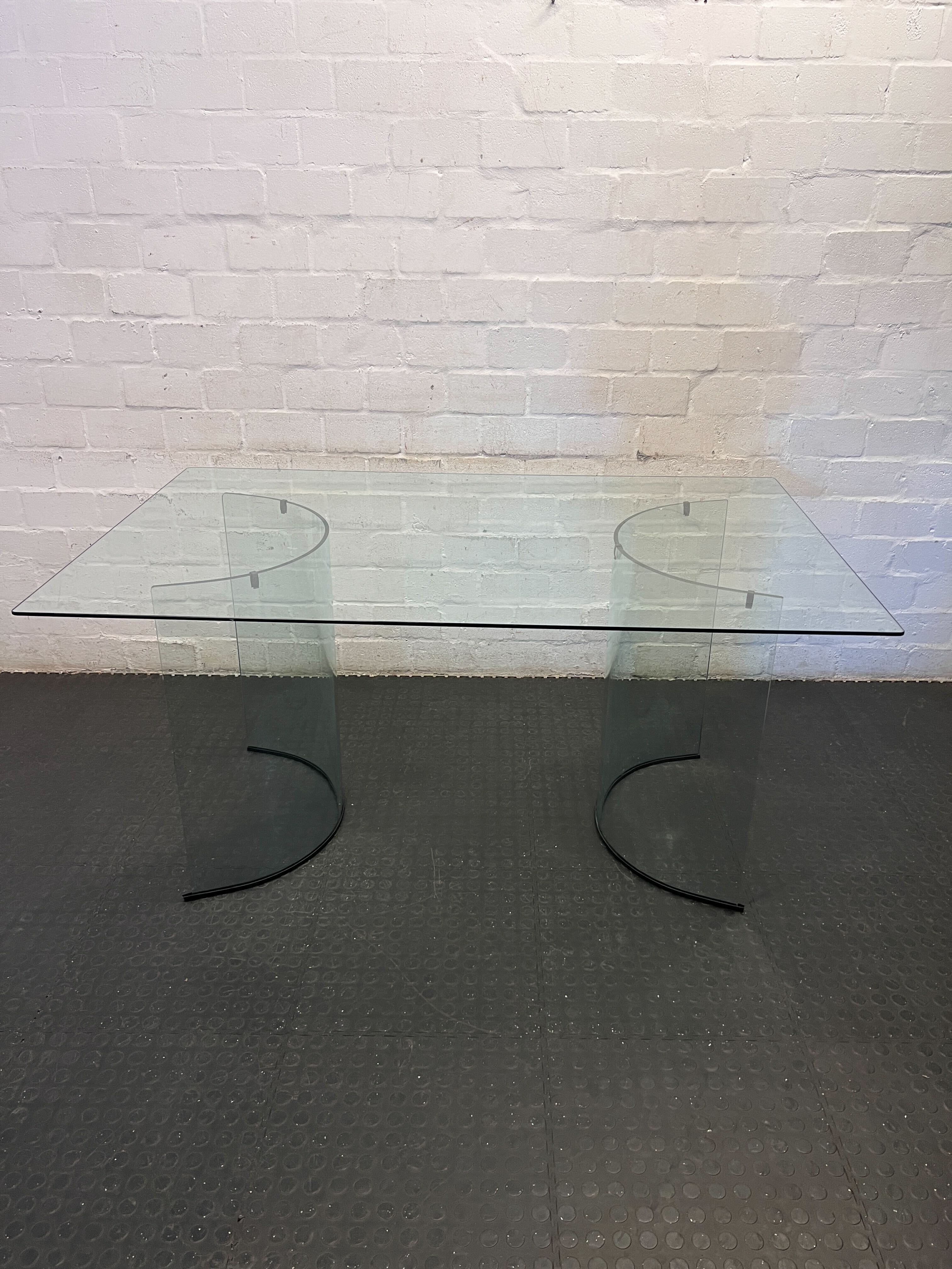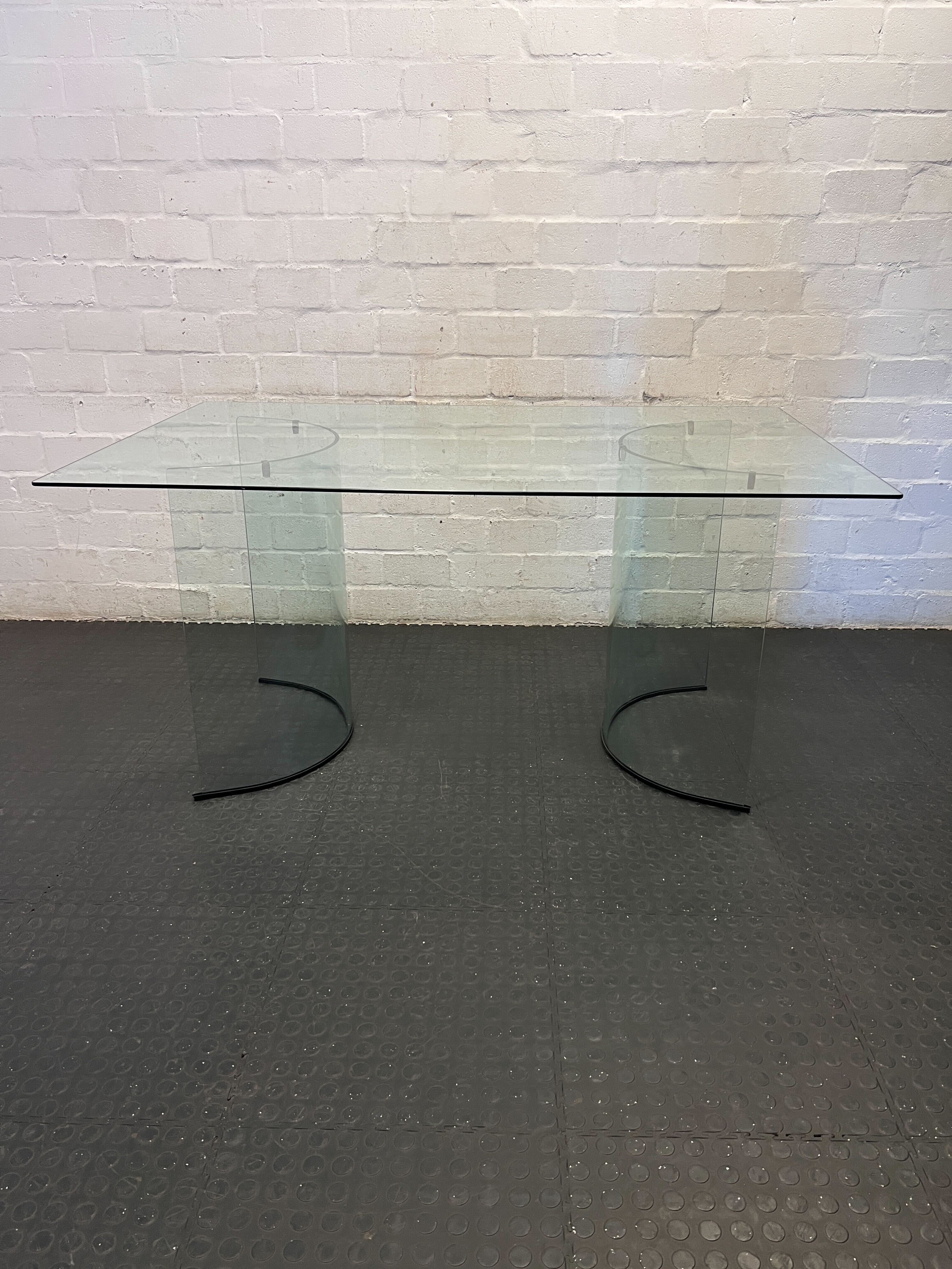 This striking glass table instantly elevates any dining room, office, or living space with its minimalist design and sophisticated appeal ✨. Featuring a robust clear glass top and two elegantly curved glass bases, it's a statement piece that combines functionality with high style. Perfect for family dinners, important meetings, or as a chic display surface. The table is in good used condition. The glass top appears largely clear with minor surface scratches consistent with normal use, which are common for glass items. The curved glass bases are sturdy, and the black accents at the bottom are intact, though there may be slight signs of wear on these edges. Overall, a well-maintained piece ready for its new home!