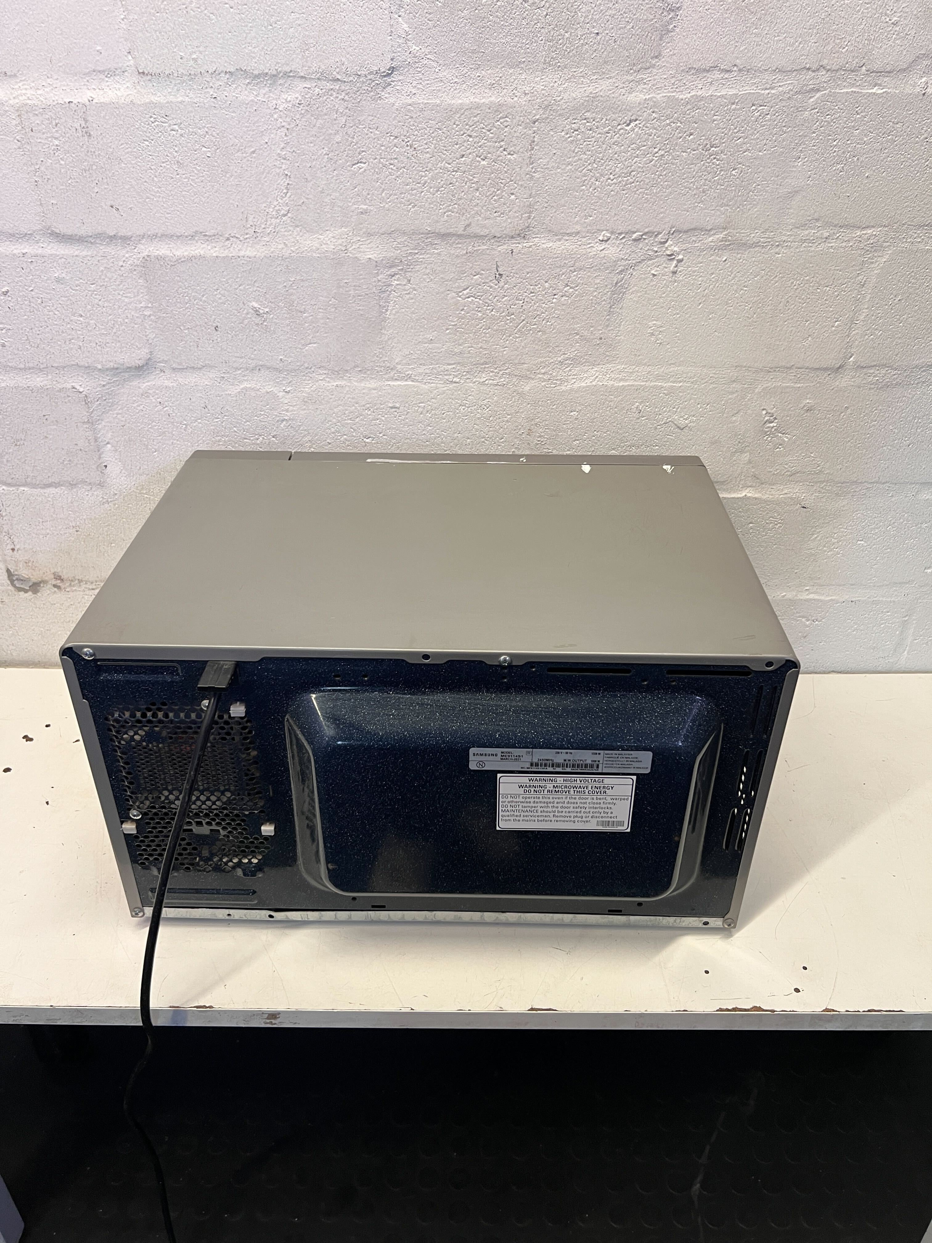 Upgrade your kitchen with this sleek and efficient Samsung Microwave Oven! ✨ Perfect for quick meals, reheating leftovers, or defrosting ingredients, this microwave combines modern design with practical functionality. Its user-friendly interface makes meal prep a breeze, and the metallic grey finish adds a touch of sophistication to any kitchen countertop. Despite being pre-loved, it's ready to serve your culinary needs! ♨️ This Samsung microwave is in good, used condition. There are some minor cosmetic scuffs and surface wear visible on the top casing and edges, as expected from a second-hand appliance. The door and control panel are clean and fully functional. A '10 Year Warranty' sticker is present on the door, indicating its durable build. Please refer to the images for a detailed view of its current state.