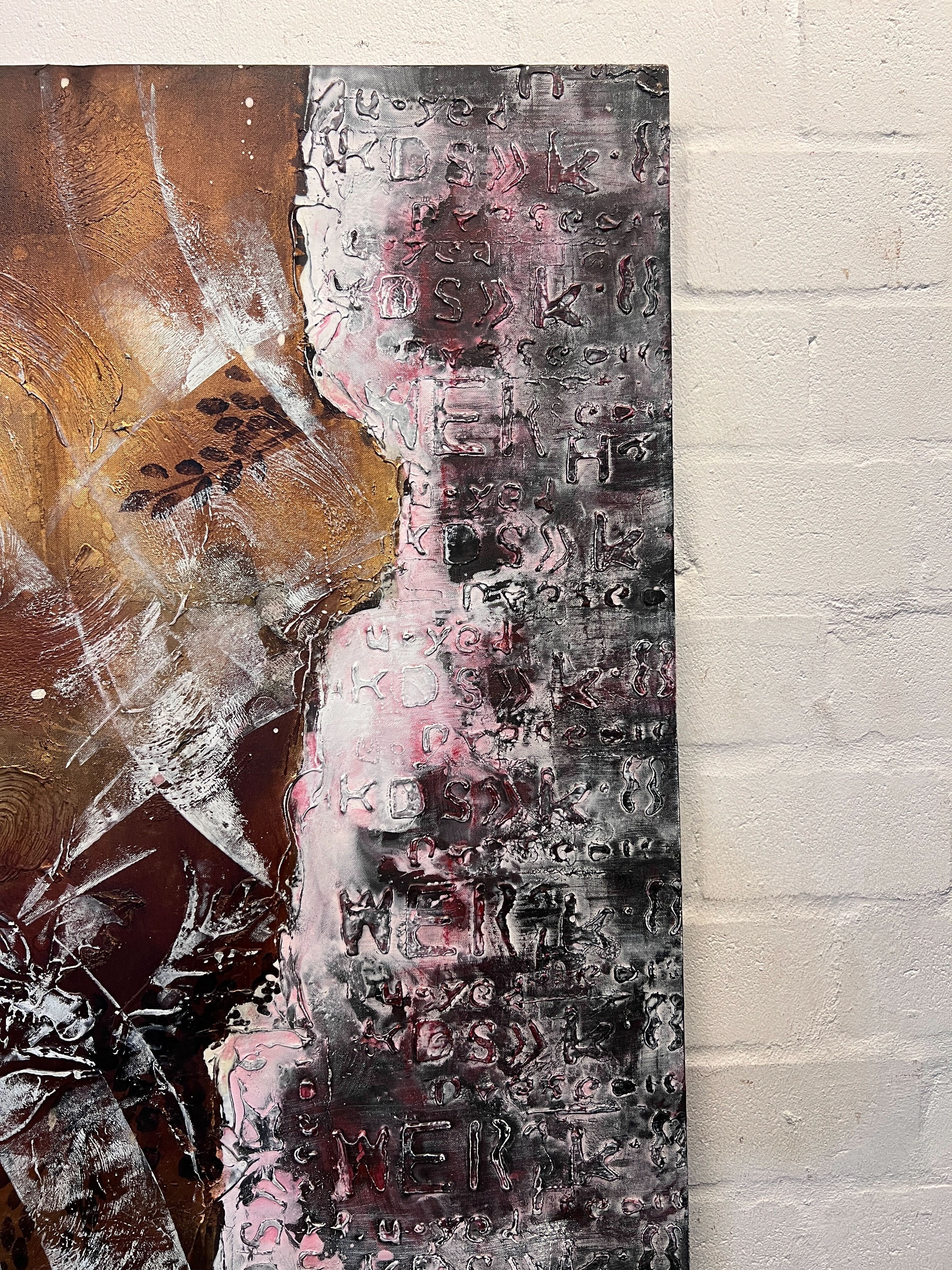 Elevate your living space with this captivating Textured Bronze & Gold Abstract Canvas Art! ✨ This stunning mixed-media piece features a dynamic interplay of rich bronze, shimmering gold, crisp white, and deep black, with subtle hints of pink, creating an intricate and unique visual experience. The textured surface, adorned with intriguing patterns and symbolic elements, adds depth and character, making it a true conversation starter. Perfect for adding a touch of contemporary elegance or a bold focal point to any room, from your living room to a chic office space. 🎨 This artwork is in excellent pre-loved condition. The intentional textural elements and distressed appearance are part of its unique artistic style. There are no noticeable flaws or damages beyond its inherent design, as can be seen in the provided images.