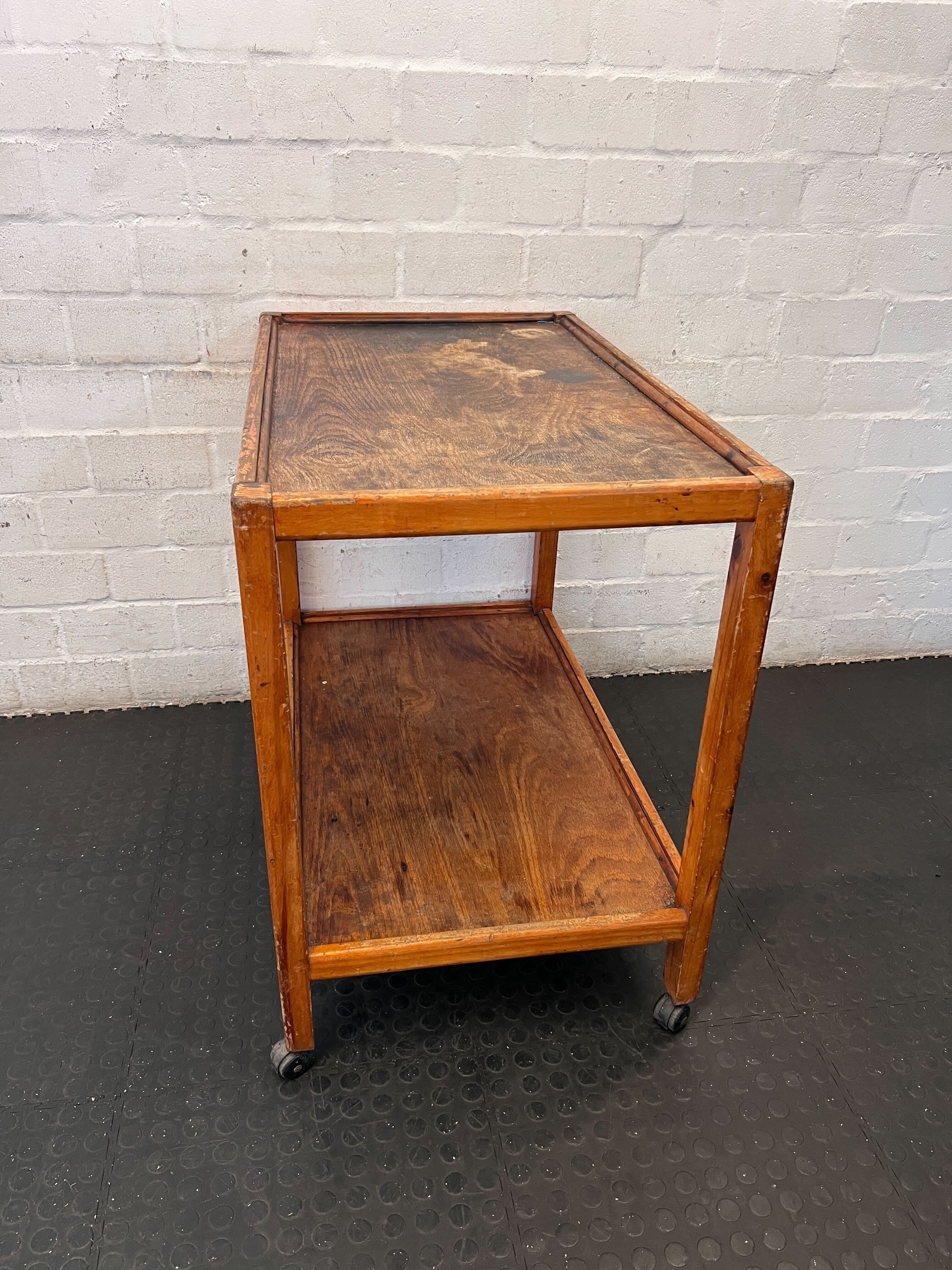 Discover the charm of yesteryear with this lovely vintage-style wooden serving trolley! 🚚 Perfect for adding a touch of rustic elegance to your home, this versatile two-tiered cart features convenient castor wheels, making it easy to move wherever extra surface space or storage is needed. Use it as a delightful serving cart for entertaining, a unique side table next to your sofa, or a practical mobile storage solution in your kitchen or lounge. Its warm wood grain and classic design will effortlessly complement various interior styles. ✨ This charming trolley is in good vintage condition, reflecting its journey through time. The wooden surfaces display characteristic signs of wear, including various scratches, scuffs, and some noticeable watermarks or discoloration on both the upper and lower shelves. These imperfections contribute to its authentic antique appeal. The frame remains sturdy, and all four castor wheels are fully functional, ensuring smooth mobility. Please examine all provided images to appreciate its unique character and condition fully.