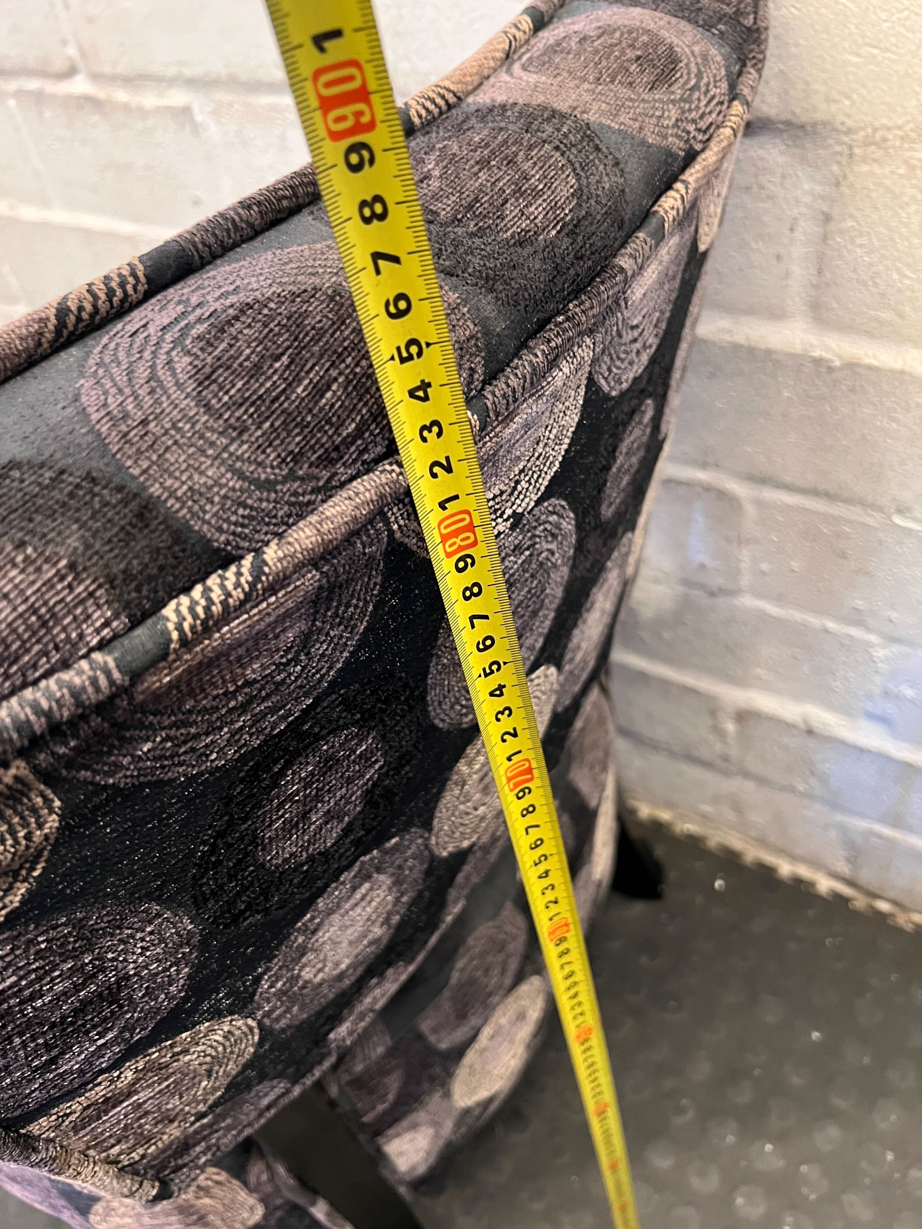 Add a pop of personality to any room with this chic slipper chair! ✨ Its unique circular pattern in various shades of grey, purple, and brown creates a captivating visual interest, perfect for a modern or eclectic interior. This compact, armless chair is ideal as an accent piece in a living room, a stylish addition to a bedroom vanity, or a cozy spot in a reading nook. Its distinctive design makes it a statement piece without overwhelming your space. 🛋️