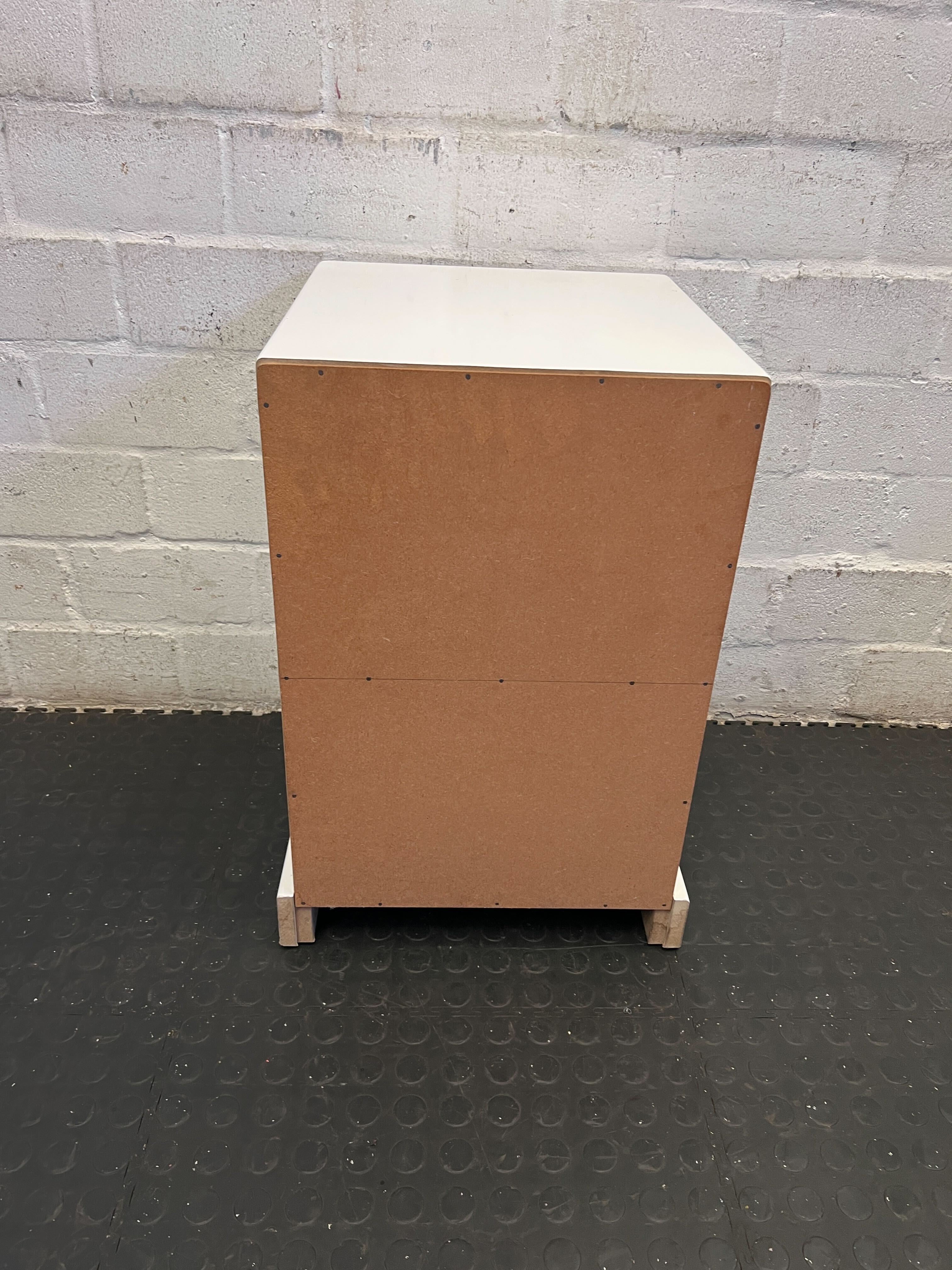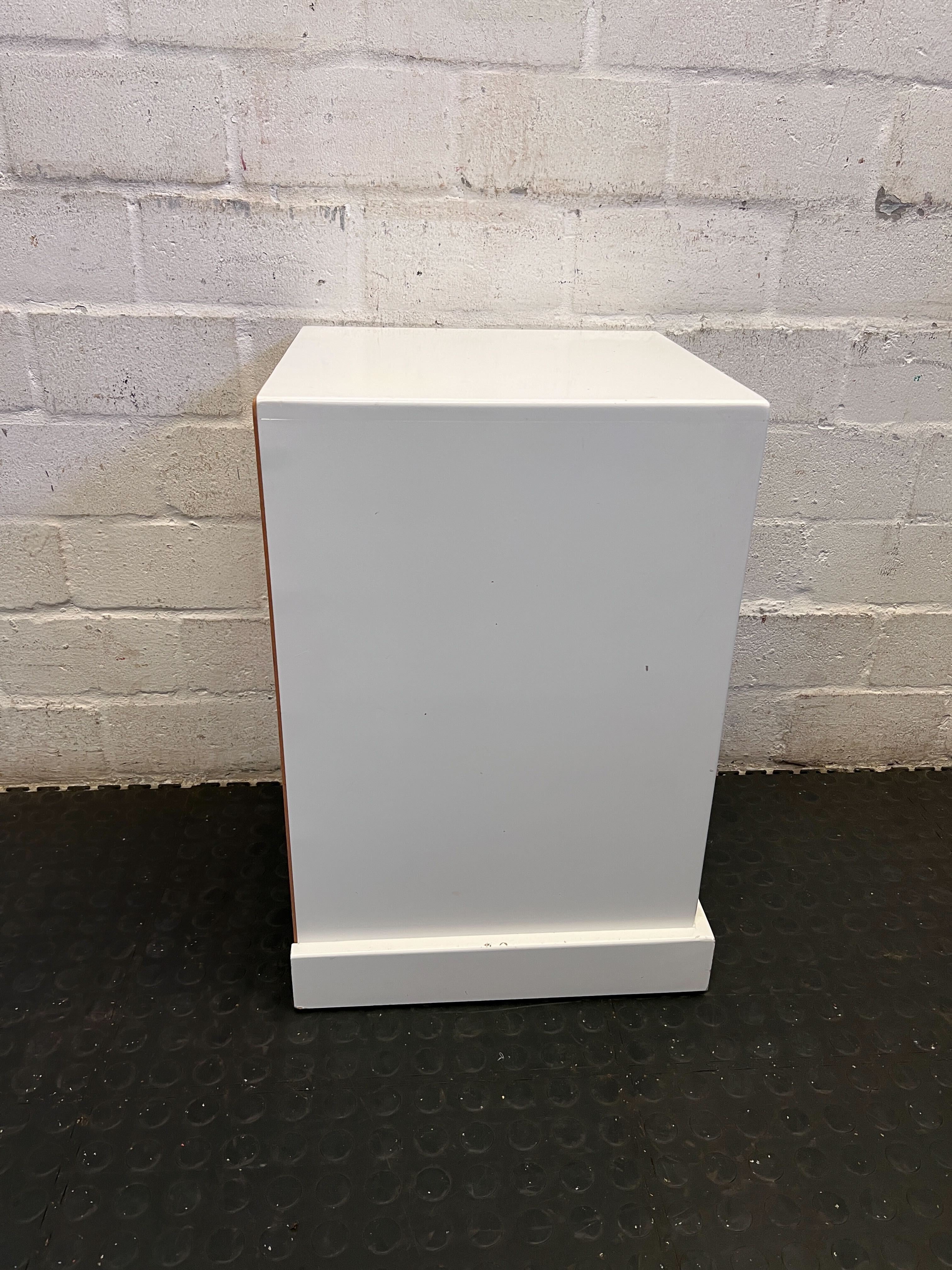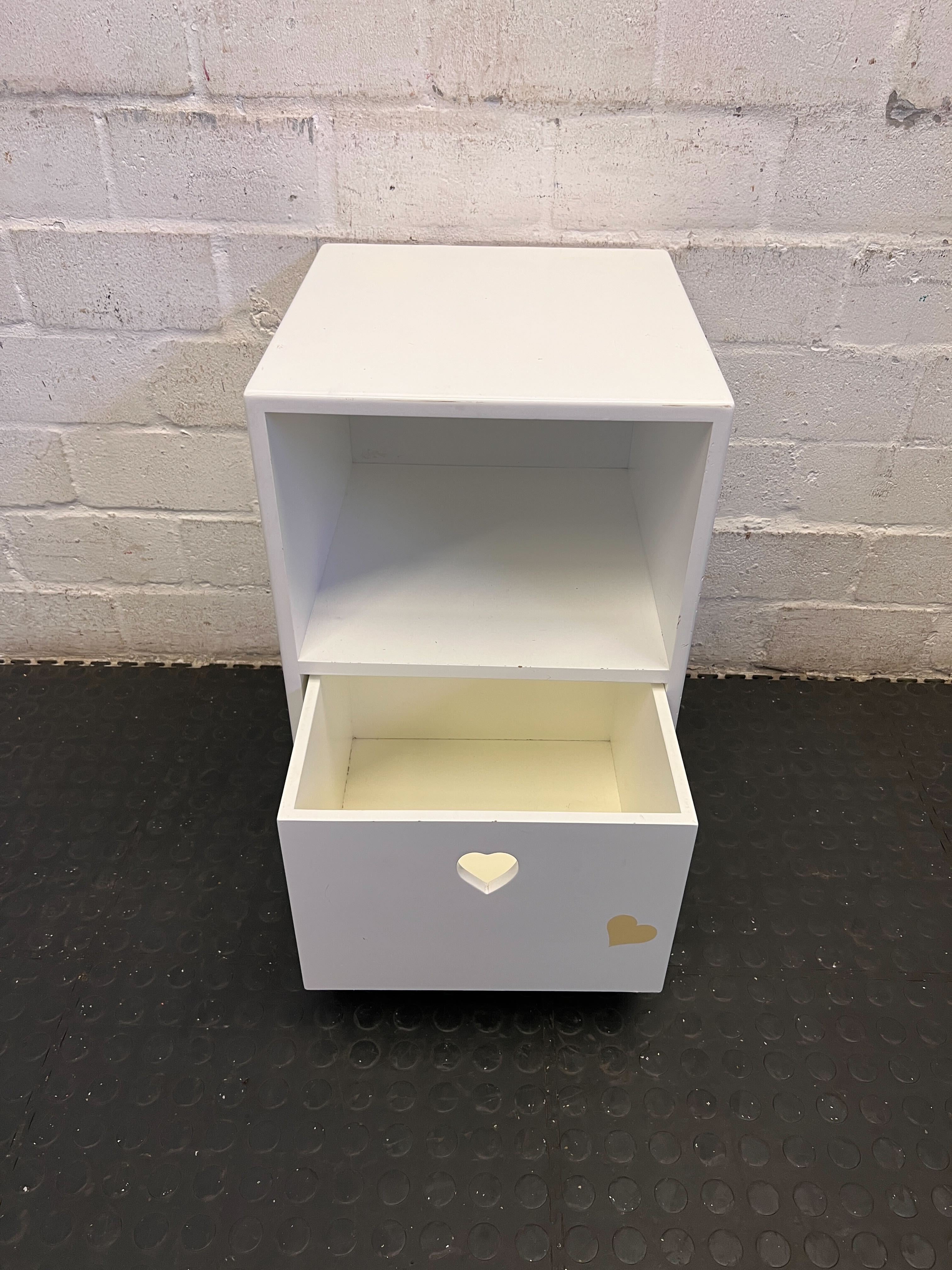 A57069This lovely white storage unit or bedside table brings a touch of charm to any room! ✨ Perfect for a child's bedroom, a cozy nook, or even as a unique side table, it features an open shelf for displaying treasures and a lower drawer with an adorable heart-shaped cutout handle and a cute yellow heart decal. Its compact design makes it versatile for various spaces. Condition: This item is in good second-hand condition with some signs of wear consistent with its age and previous use. There are minor scuffs and marks visible on the white surface, particularly on the lower front edge. The small yellow heart decal also shows some slight wear. Please refer to the images for a detailed view of its current state. #BedsideTable #KidsRoomDecor #StorageSolution #HeartDesign #2ndhandwarehouse 🧡