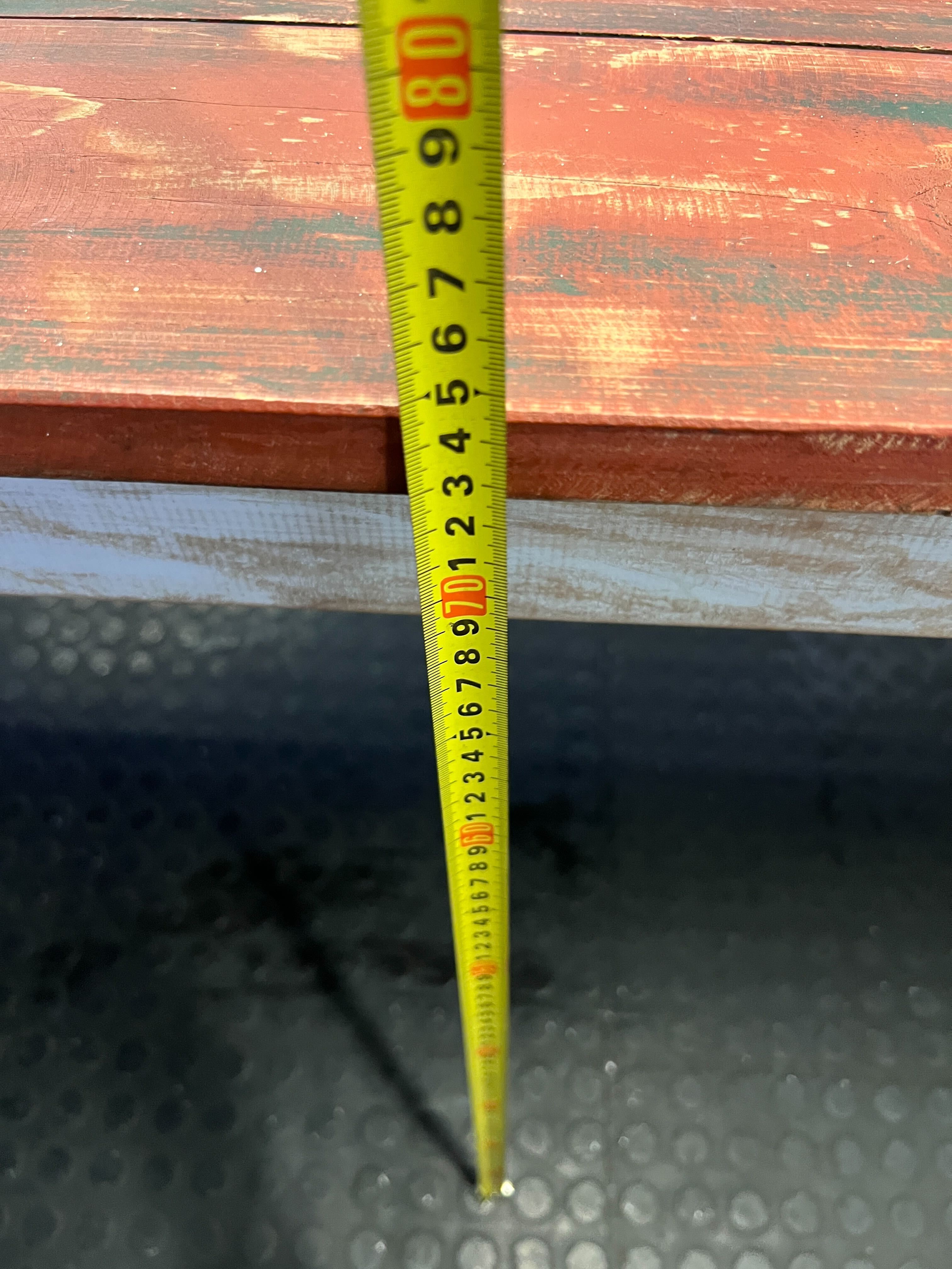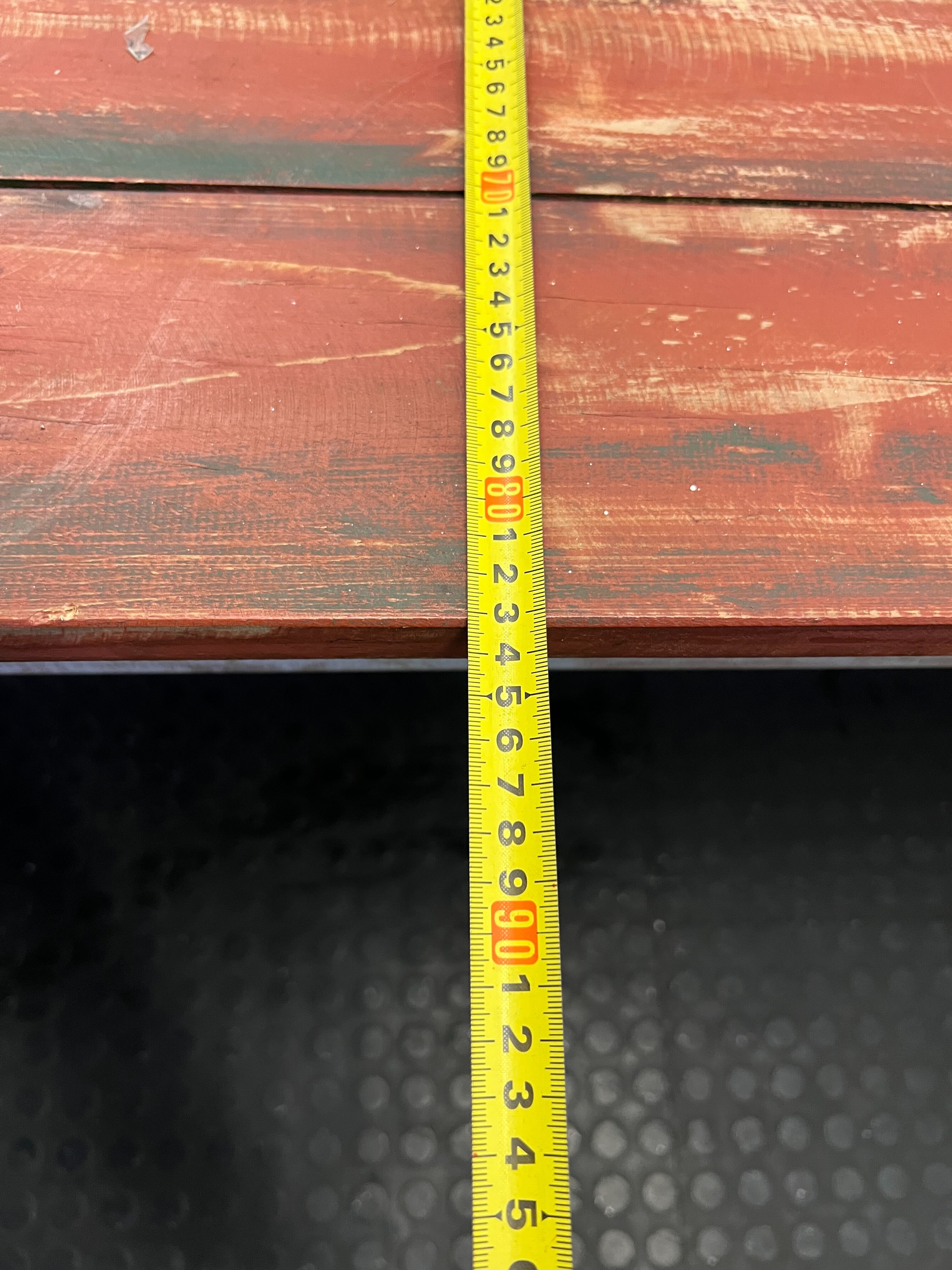 A57308This charming vintage-style wooden table brings a touch of rustic character to any space! ✨ With its beautifully distressed red-toned plank top and sturdy white-washed legs, it's perfect as a unique workbench for creative projects, a distinctive console table in your entryway, or even a casual dining table for a cozy kitchen. Its robust construction and timeworn aesthetic tell a story, ready to become a beloved piece in your home or studio. Condition: This table is in good vintage condition, showcasing considerable character from its previous life. The red plank top displays intentional distressing, fading, scratches, and minor imperfections consistent with its rustic style and age. The white-washed legs and frame show significant paint chipping, scuffs, and natural wear, adding to its authentic charm. All structural components are solid and stable. #RusticFurniture #VintageTable #Workbench #FarmhouseDecor #2ndhandwarehouse 🧡