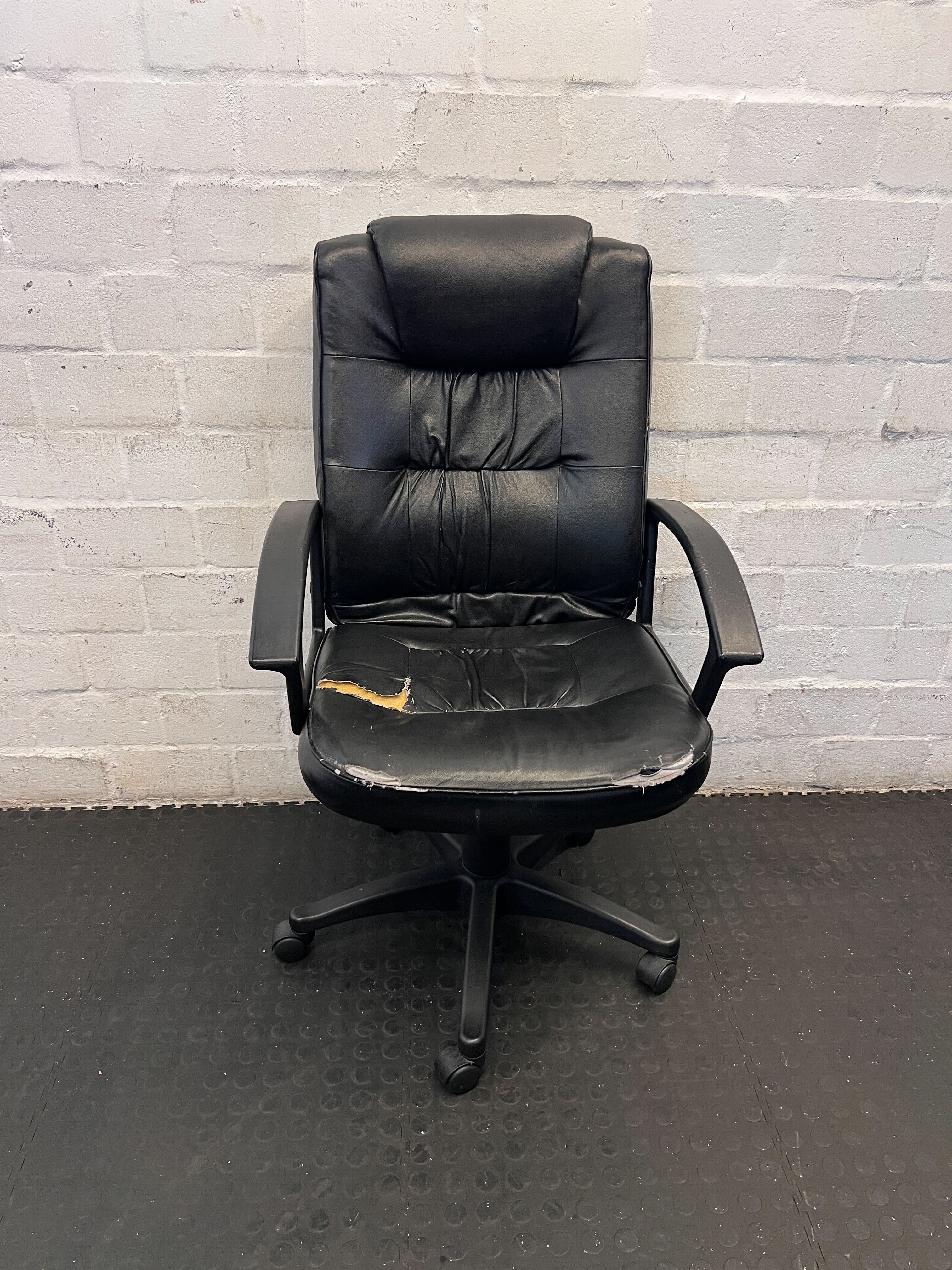 A57540Upgrade your workspace with this pre-loved black executive-style office chair! ✨ Featuring a padded backrest and seat, this chair is designed for comfort during long hours at your desk. Its swivel base and armrests offer practical functionality, making it a great addition to any home office or business environment. Perfect for those looking for an affordable seating solution with classic appeal. 🛋️