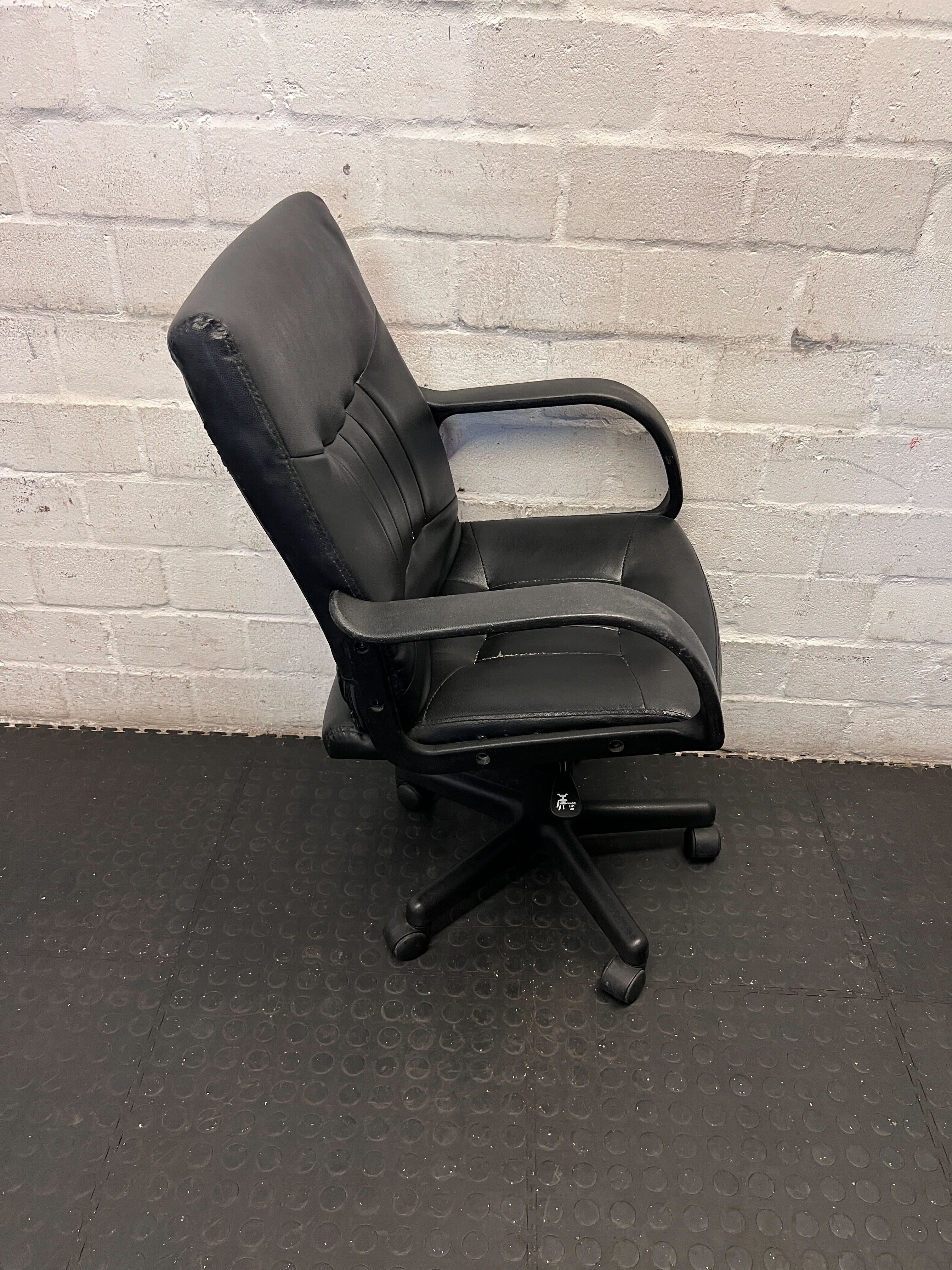 A57655Upgrade your home office or workspace with this functional and comfortable black faux leather office chair! ✨ Designed for productivity and support, it features a classic design, swivel base, and rolling casters for easy mobility. Perfect for students, remote workers, or anyone needing a dedicated desk chair. 🛋️💼