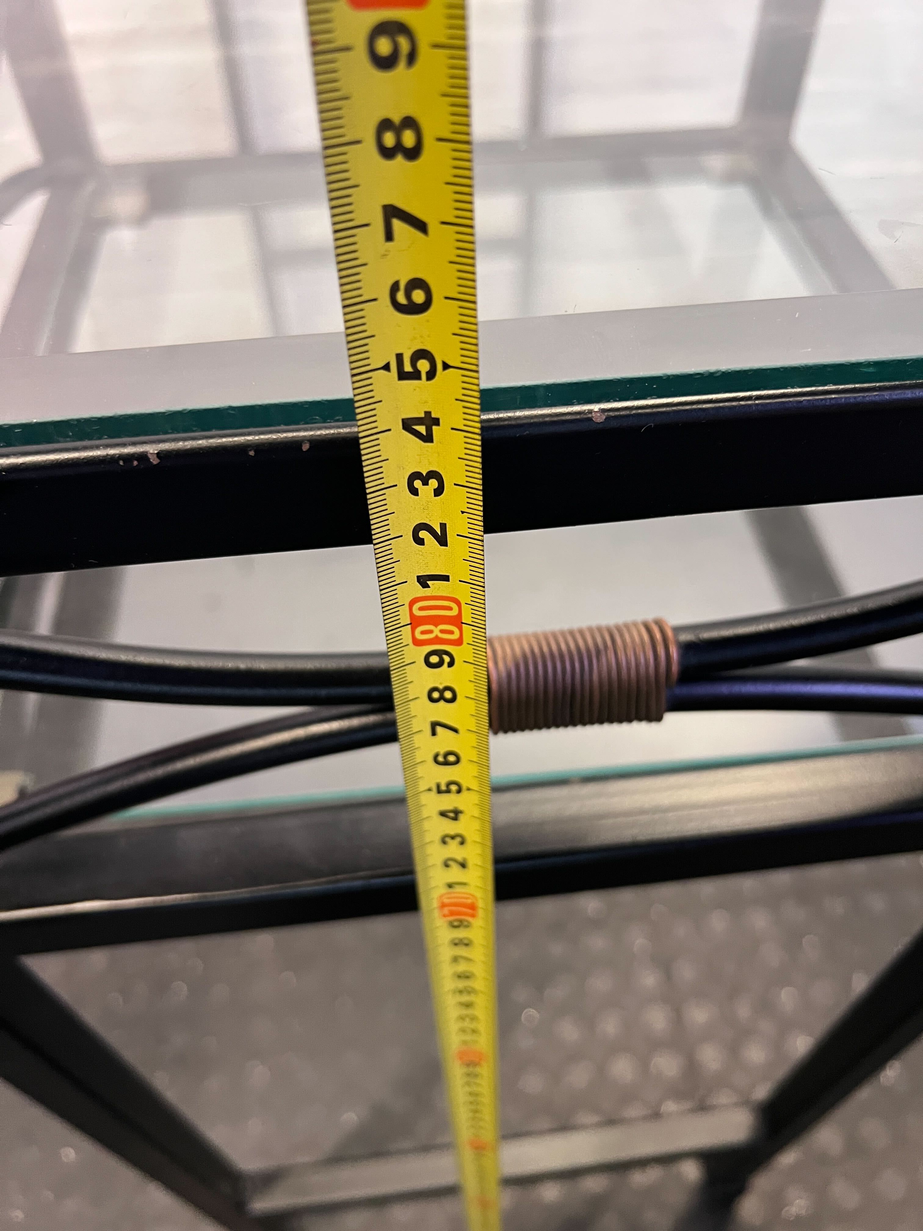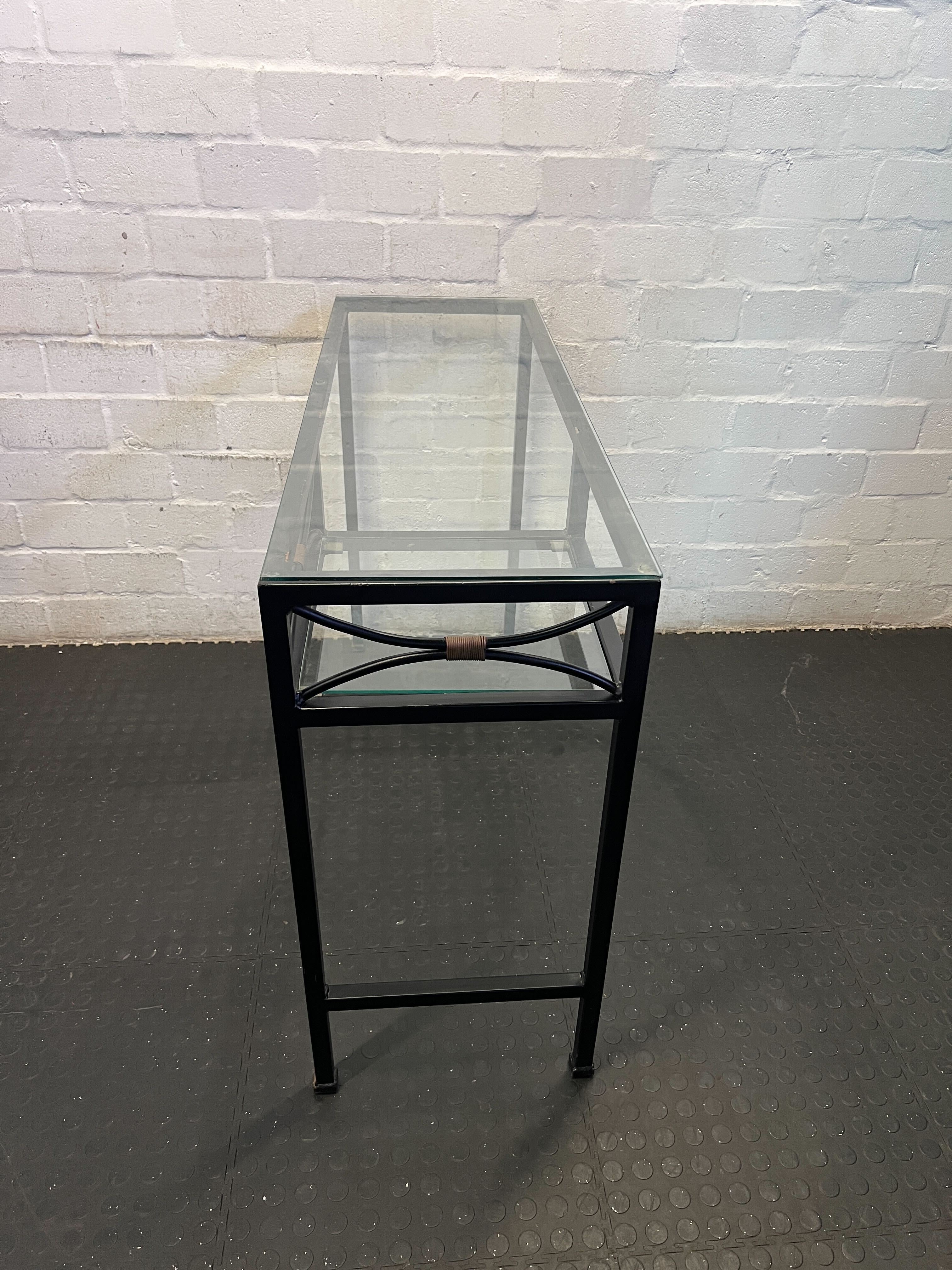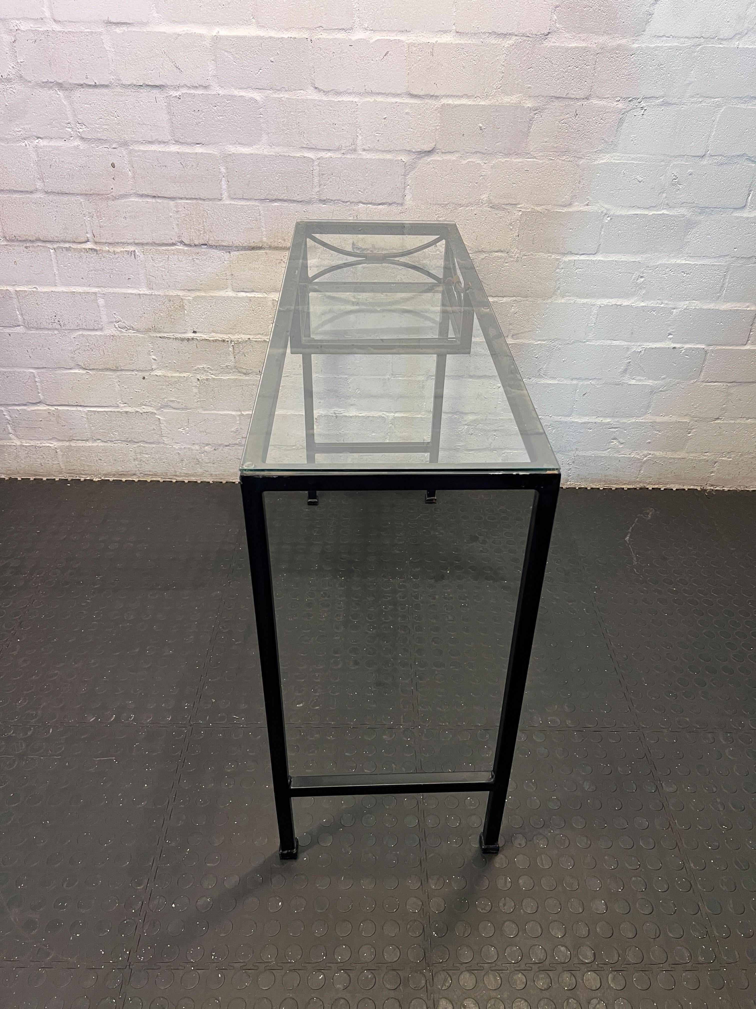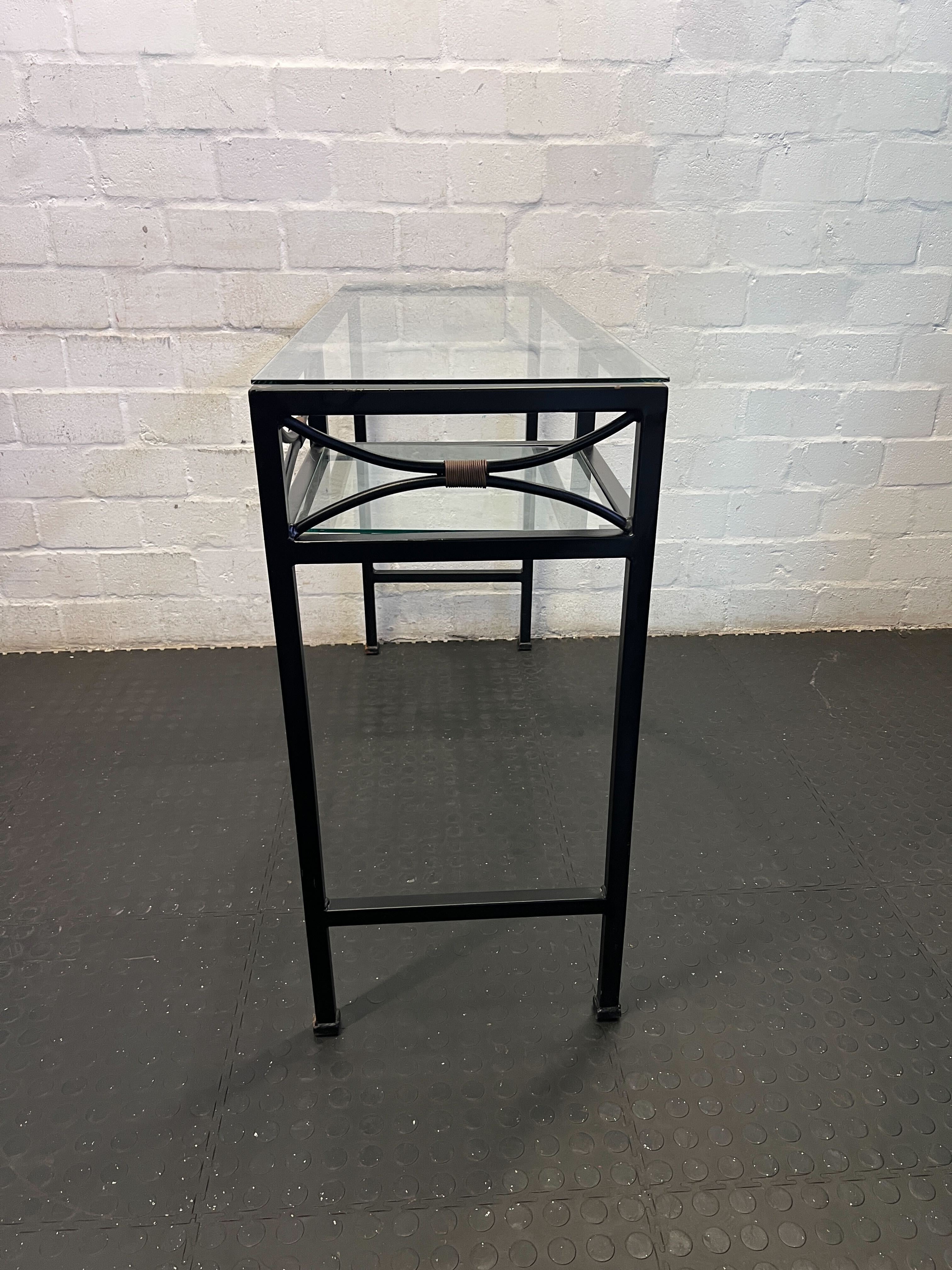 Elevate your home office or living space with this chic glass top desk, featuring a sleek black metal frame and a unique decorative element. Its minimalist design, combined with the elegant glass surface, creates an airy and sophisticated look that can easily blend with various decor styles. Perfect as a compact workstation, a stylish console table in a hallway, or even a modern vanity, this versatile piece brings both functionality and flair to any room. ✨🏡 This desk is in good pre-owned condition, showcasing its previous life with some minor wear consistent with use. There might be some light surface scratches on the glass top and subtle scuffs on the black metal frame, particularly on the legs, as visible in the images. The structural integrity is sound.💎