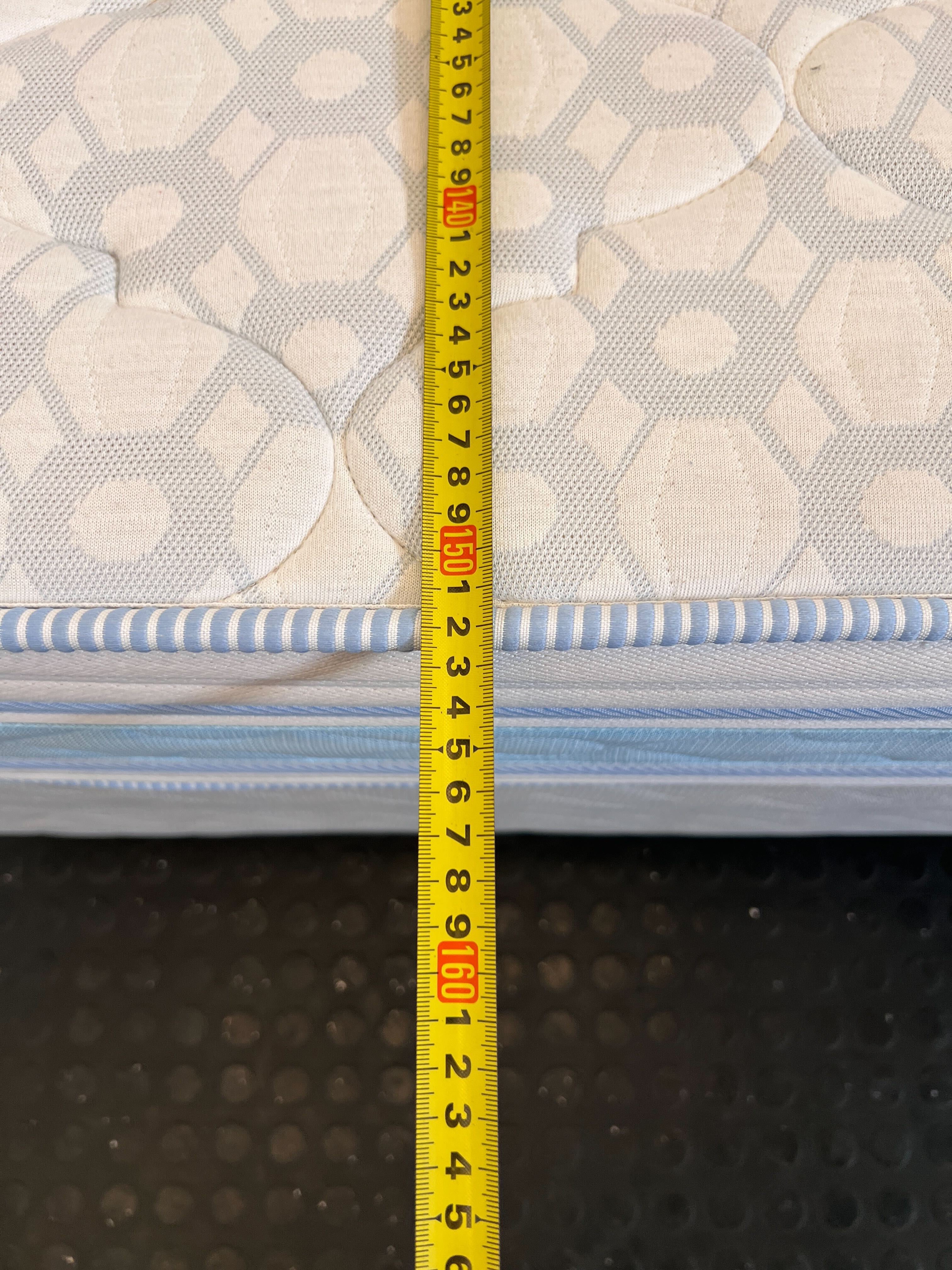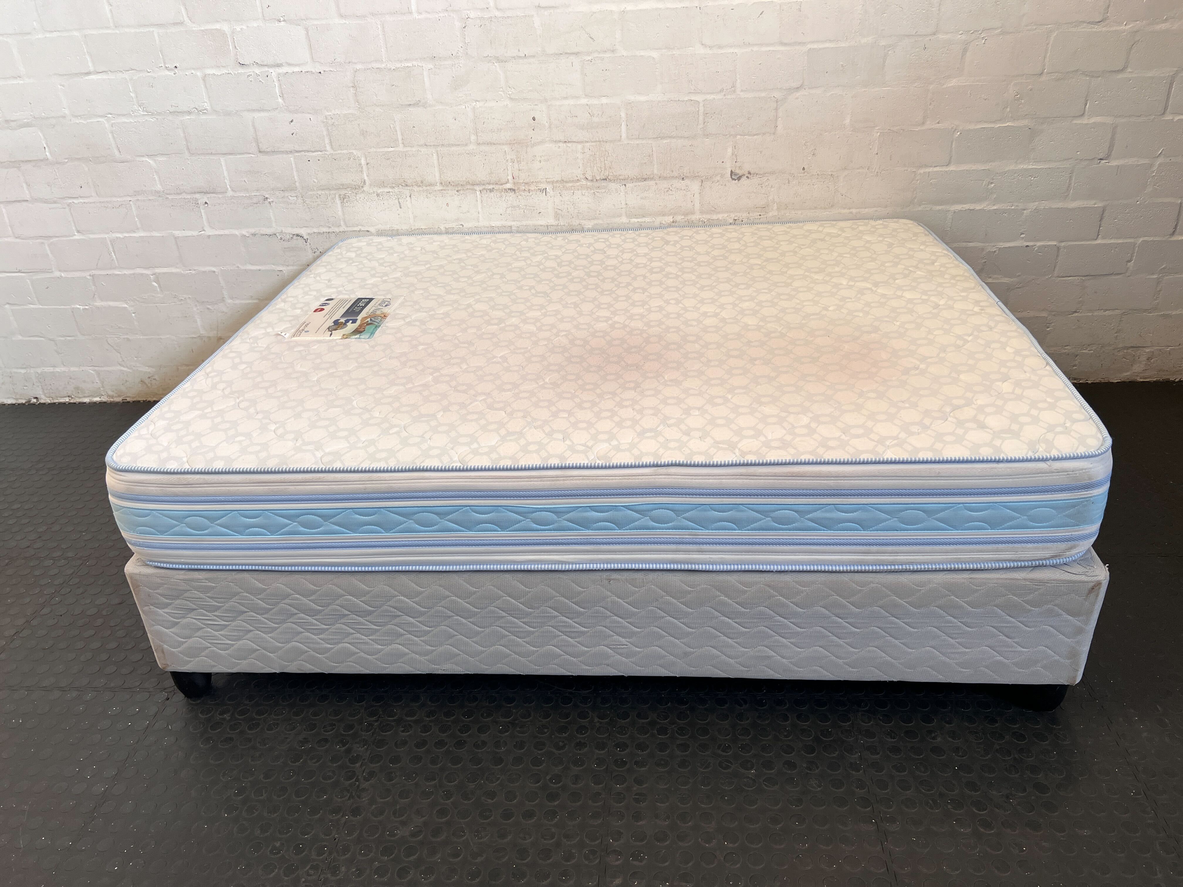 Upgrade your bedroom with this comfortable and practical mattress and base set! This ready-to-use bed offers a cozy sleeping experience with its quilted top and stylish blue and white striped border. Perfect for a guest room, child's bedroom, or even your main sanctuary, it provides a complete sleeping solution without the hassle. Simply add your favorite linen and enjoy a restful night's sleep! 🛏️✨This mattress and base set is in good, pre-owned condition. It has been well-maintained with only minor signs of use consistent with a second-hand item. No major stains, tears, or structural damage are visible, ensuring it's ready for its new home.